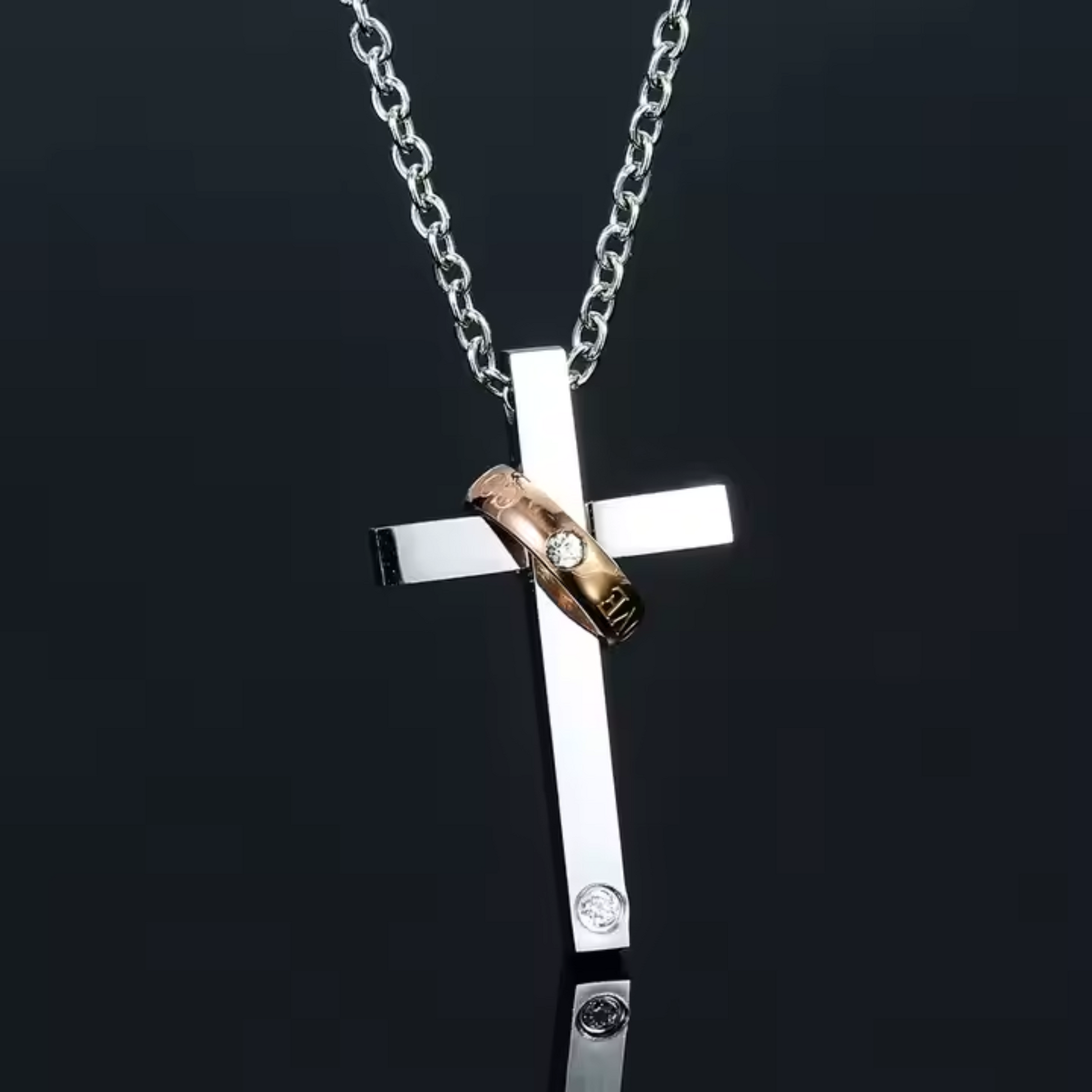 Elevate your faith-inspired style with our *Embrace of Love Cross Necklace*. This elegant piece features a stainless steel cross pendant adorned with a permanently wrapped ring, available in gold and black, engraved with the heartfelt phrase, “Cover me with love.”