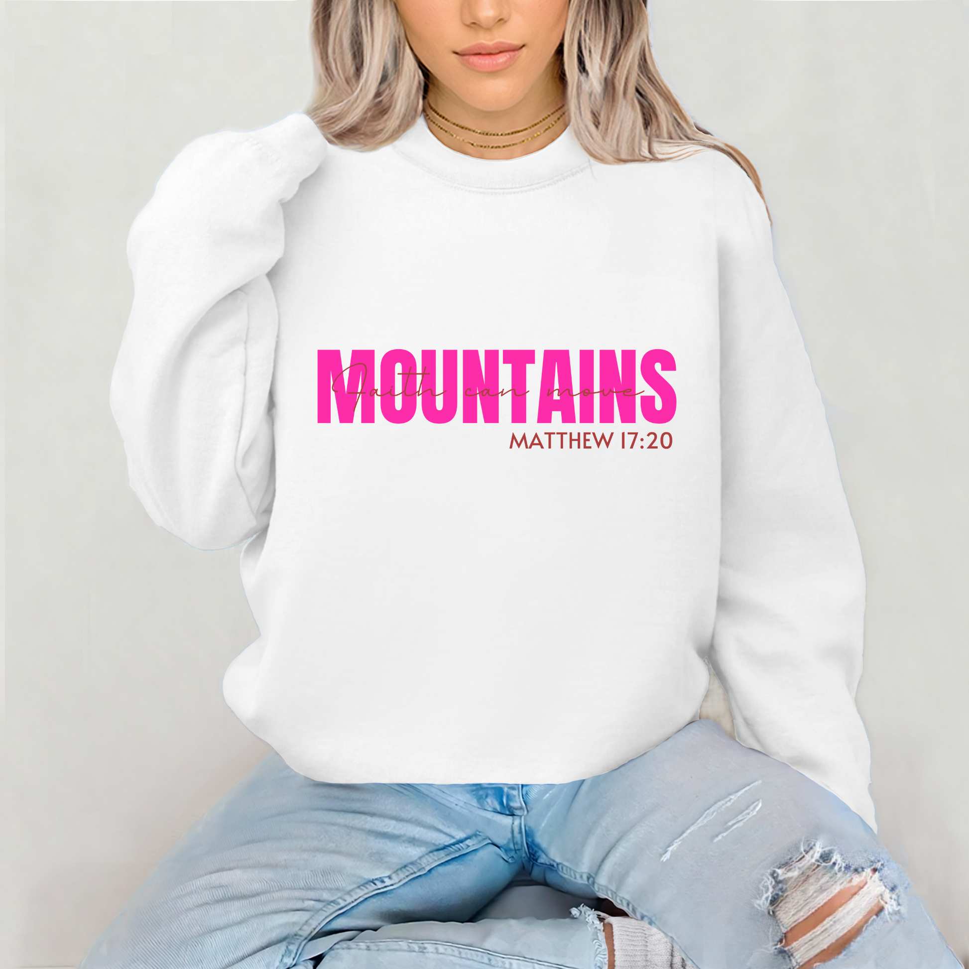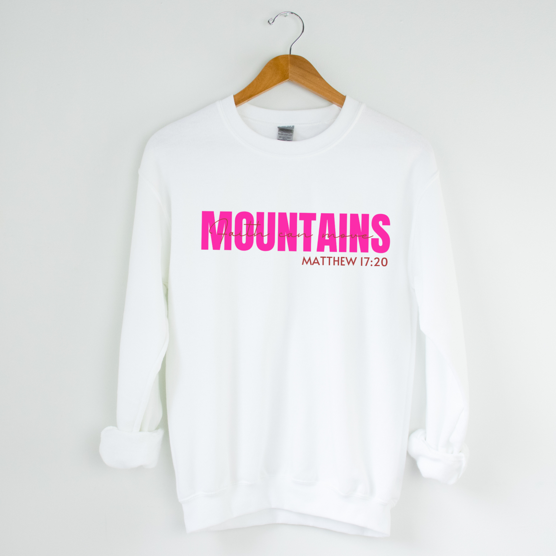 Introducing our "Mountaineer Faith Sweater", a stylish and empowering addition to your wardrobe. This white sweater with its bold statement, "Faith Can Move Mountains", displayed in metallic red vinyl and hot pink screen print ink, is designed to inspire and encourage you to conquer any challenge that comes your way.