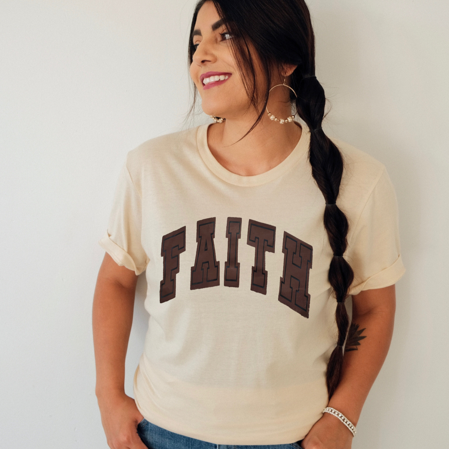 Elevate your wardrobe with our "Earth-Tone Faith Tee". This cream-colored t-shirt features the word "Faith" screen printed in a stylish varsity font, using earth-tone brown ink that perfectly complements the shirt's neutral background.