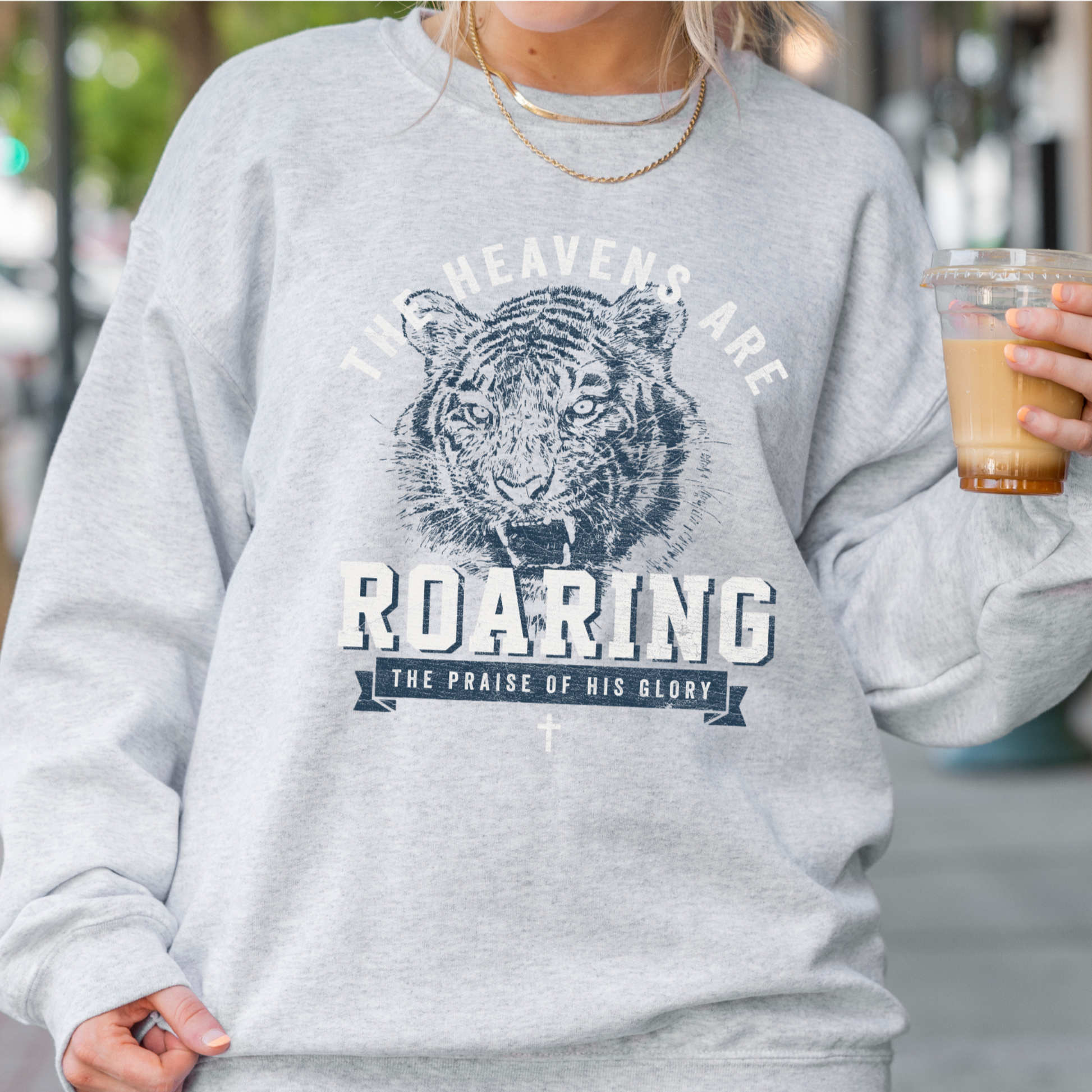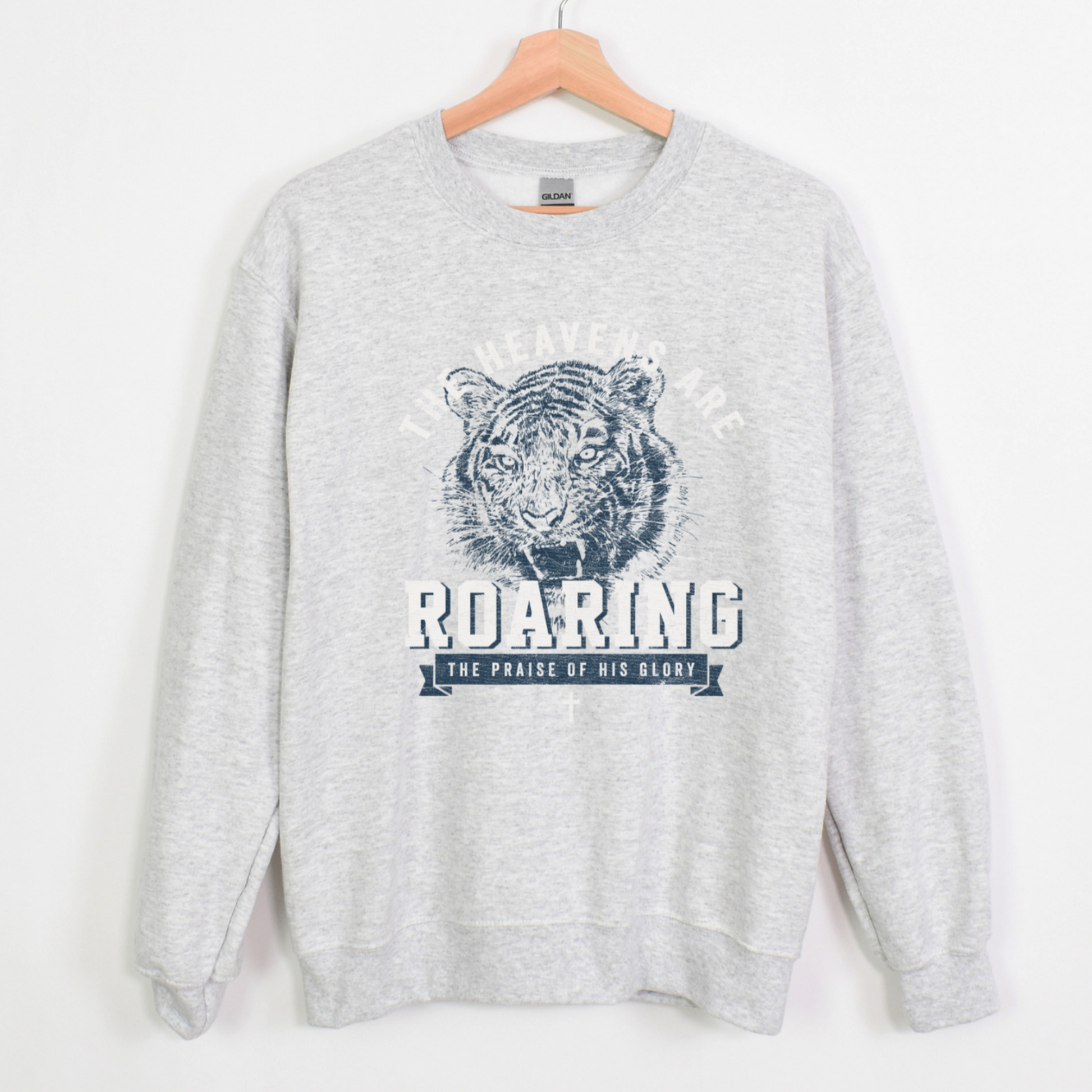 This crewneck sweatshirt, available in the colors of ash grey and baby blue, features the empowering message "The Heavens are Roaring the Praise of his glory" encircling a striking tiger head design. This crewneck serves as a reminder to embrace our own inner strength and to recognize the splendor of God's creation.