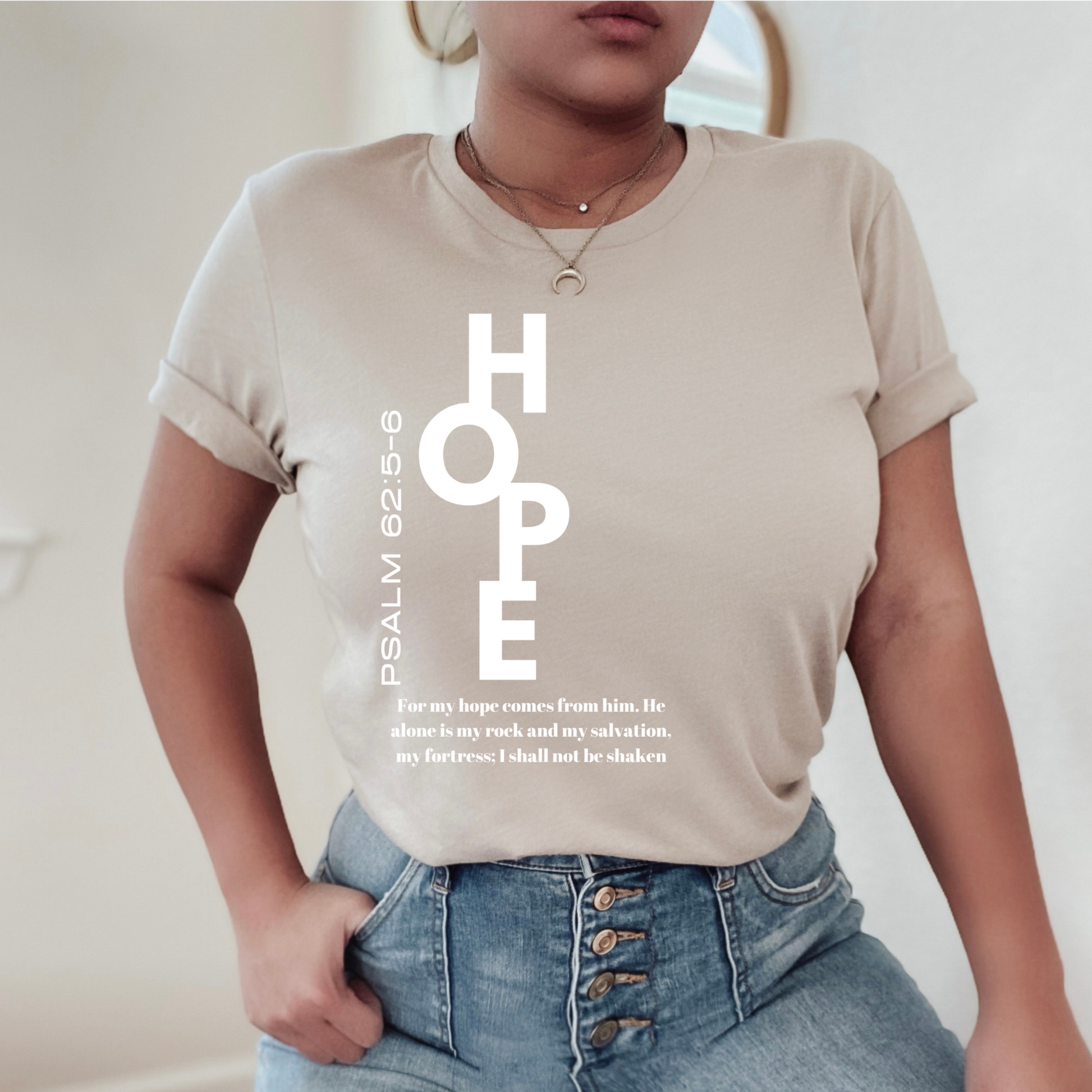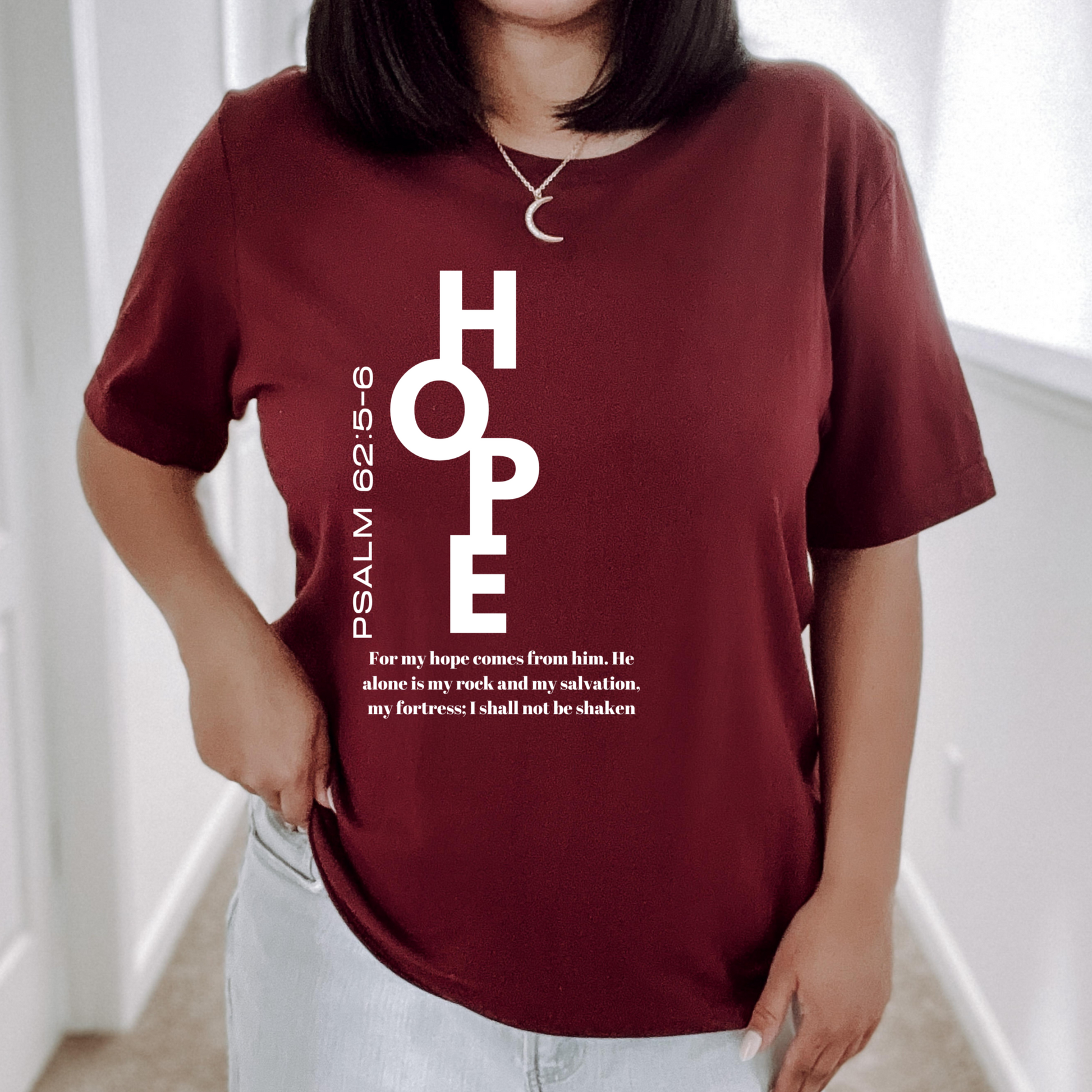On the front of the t-shirt, beautifully scripted in an elegant font, you'll find the powerful Bible verse from Psalm 62: 5-7. These verses serve as a reminder that our hope and trust are in God alone.