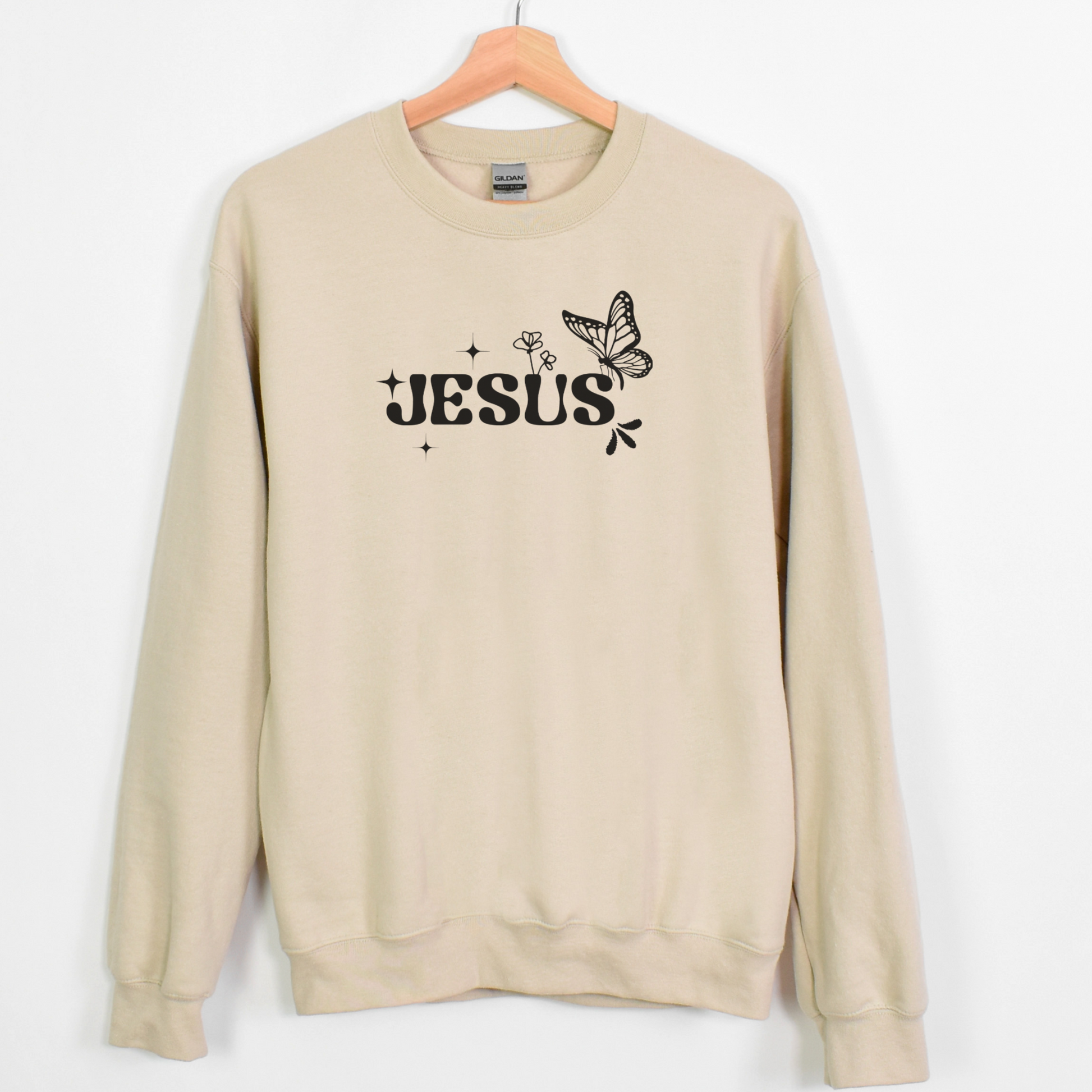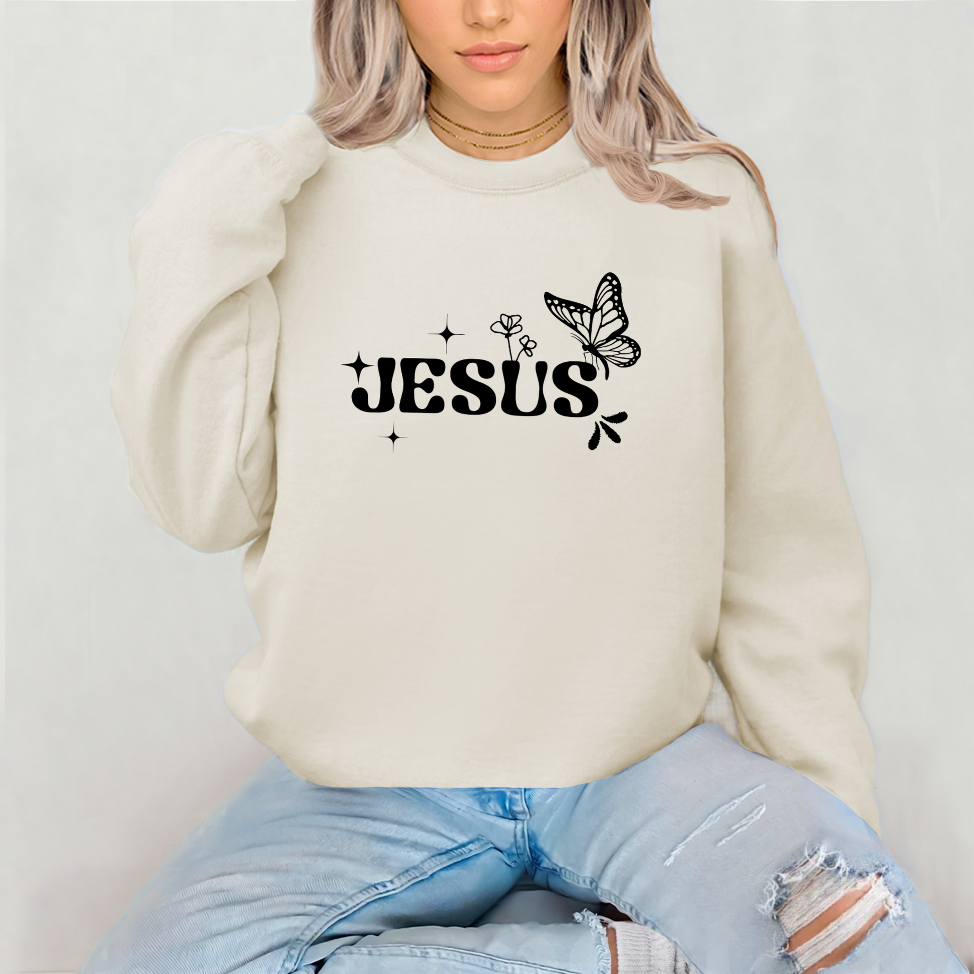 This Jesus-inspired sweatshirt, designed in a sand-colored base, features beautifully illustrated black flowers and butterflies, symbolizing transformation and the beauty of nature. Crafted with comfort in mind, this sweatshirt is made from high-quality materials that guarantee a cozy and soft feel against the skin. The loose fit ensures a relaxed and comfortable wear, perfect for casual occasions or cozy nights in.