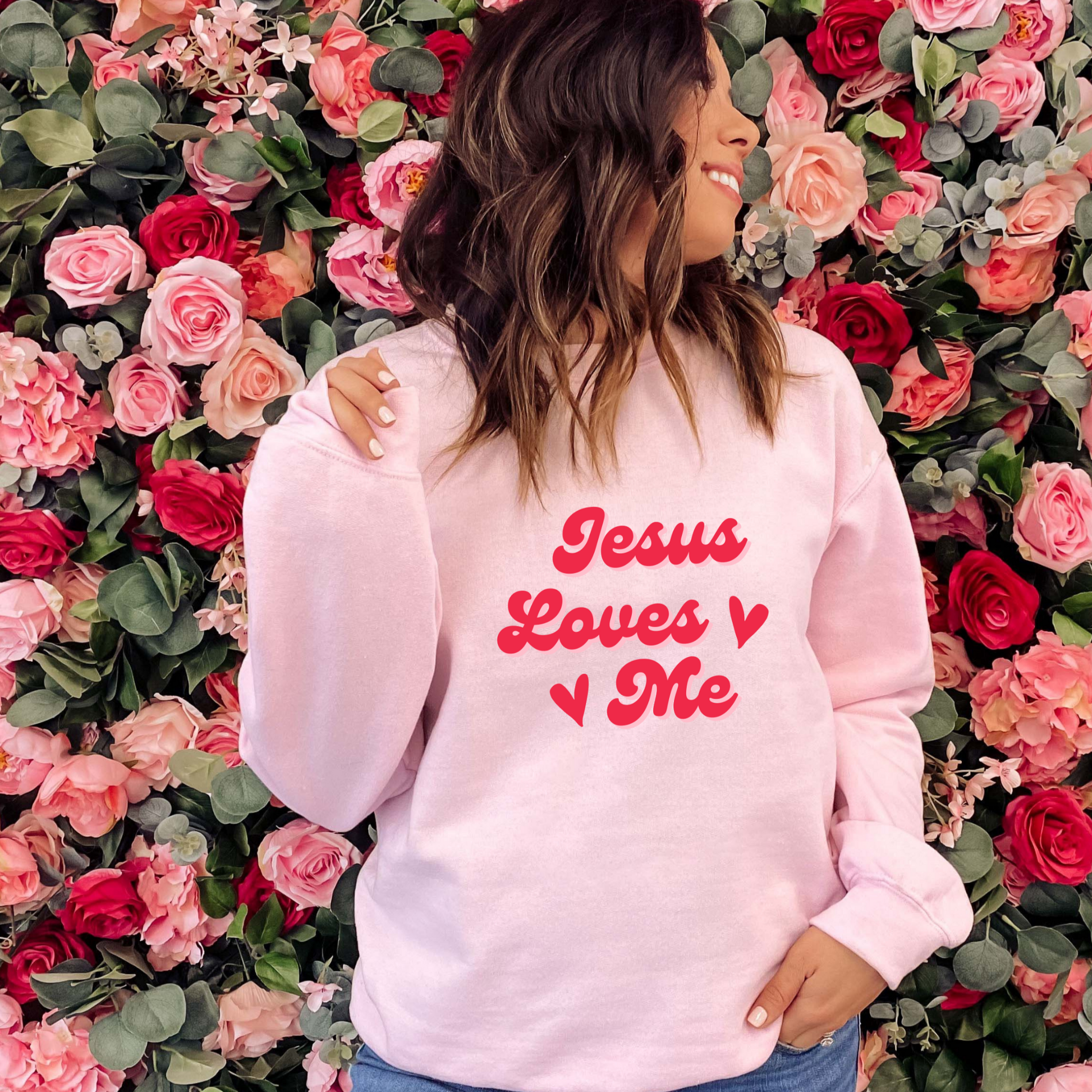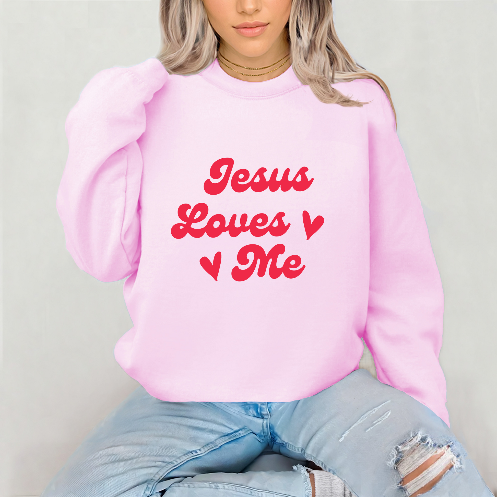 In gorgeous pink vinyl, the words "Jesus Loves Me" accentuate the delicate pastel hue, making a bold statement of love and devotion. The thoughtful design adds a touch of spirituality to your everyday look, making it a perfect gift option for yourself or someone special.
