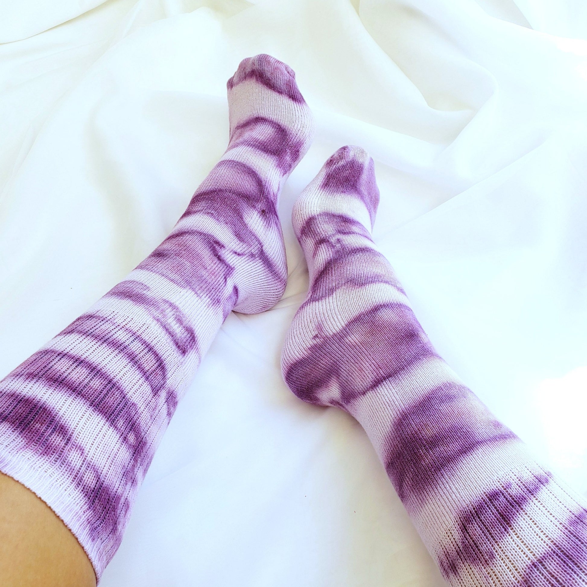 Featuring a unique tie-dye pattern in cool, icy tones, these socks are the perfect blend of fun and trendy. The high leg length adds a touch of drama and makes them ideal for pairing with skirts, shorts, or even showing off under ripped jeans.