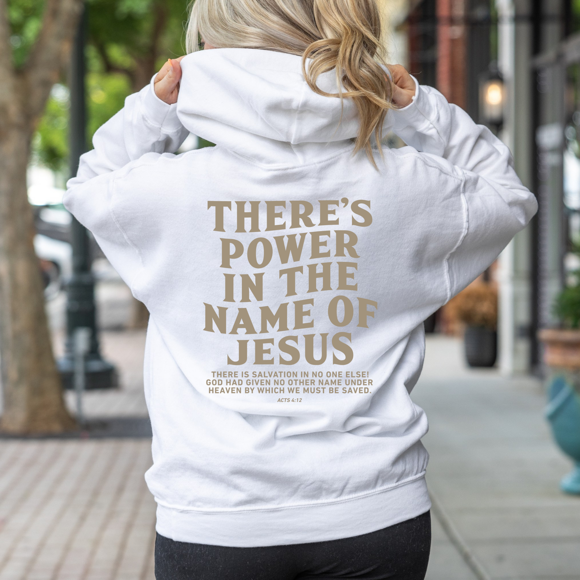 Stay warm and stylish while spreading a powerful message with our Power in the name Jesus Hoodie. Featuring the words "There is power in the name Jesus" with the empowering Bible verse Acts 4:12 printed on the back, this hoodie is not only a fashion statement but also a testament to your faith. Made with soft and cozy material, this hoodie is perfect for everyday wear or as a thoughtful gift for someone special. Let your clothing proclaim the truth and share the message of the powerful name of Jesus wherever you go.