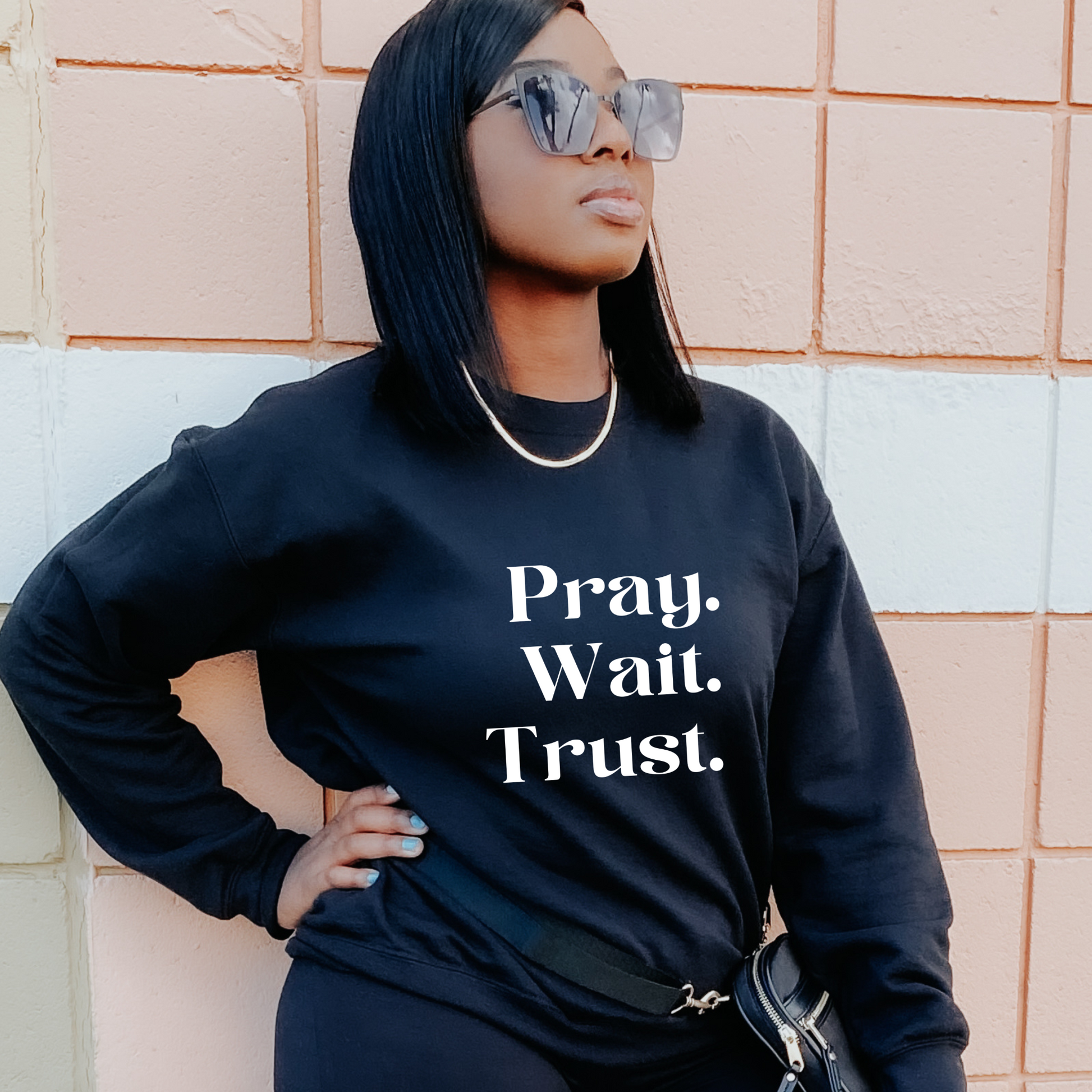 The black background makes a bold statement, while the white "Pray. Wait. Trust." lettering adds a powerful touch. These three words serve as a reminder that when we face challenges in life, the best thing we can do is pray to God, wait patiently for His response, and trust that things will work out in His perfect time.